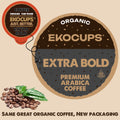 Experience the deep, complex flavors of Ekocups Extra Bold Organic Coffee. A robust roast with caramel apple and dark chocolate notes for the perfect morning boost.