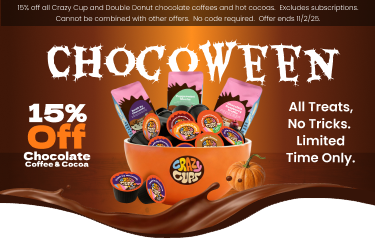 Discount automatically applies. Receive 15% off all Crazy Cups and Double Donut chocolate coffees and hot chocolates. No coupon code needed. Excludes subscriptions. Cannot be combined with other offers. Ends 11/2/25.